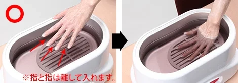 指と指がくっつかないように、手は広げた状態で、指先からゆっくりと入れましょう。
