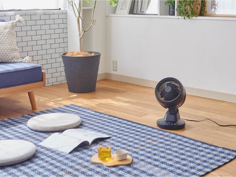 スペースの少ないキッチンや寝室、脱衣所にも置きやすいコンパクトサイズでありながら、DCモーターを搭載することで20畳まで対応のパワフルな送風ができ、リビングでもお使いいただけます。