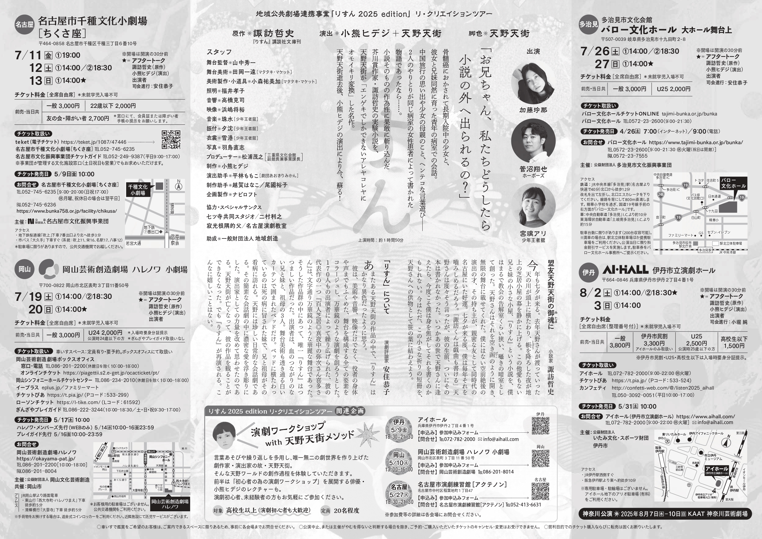 公益財団法人いたみ文化・スポーツ財団、伊丹市主催、伊丹市立演劇ホール アイホール「りすん2025 edition」リ・クリエイションツアーが2025年8月2日 (土) 〜 2025年8月3日 (日)にAI・HALL(伊丹市立演劇ホール)(兵庫県伊丹市伊丹2-4-1)にて上演されます。