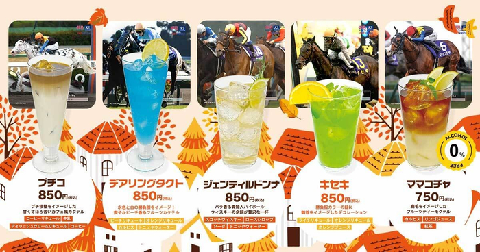 HUB・82のコラボ店舗にて、キセキ、ジェンティルドンナ、デアリングタクト、ブチコ、ママコチャをイメージしたコラボドリンクを販売。ドリンク1杯ご注文につき、5頭のオリジナルコースターをランダムで1枚プレゼントいたします。