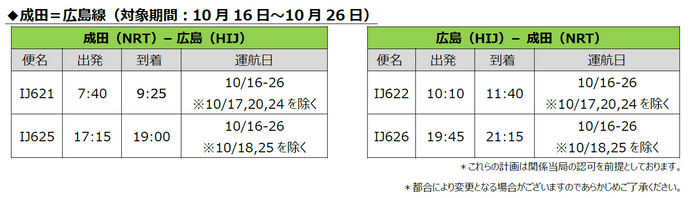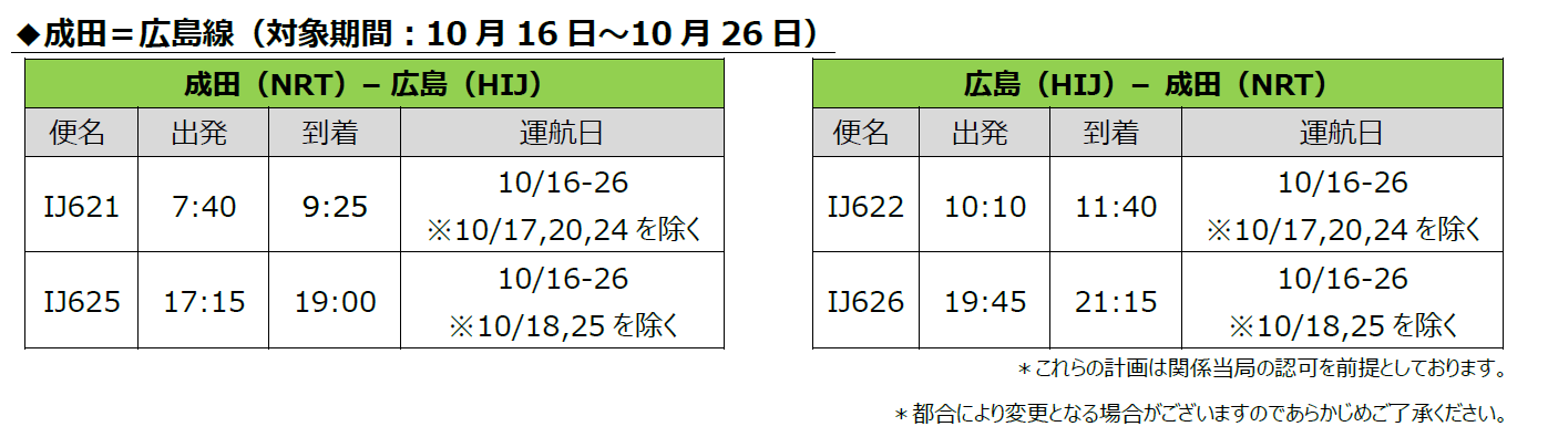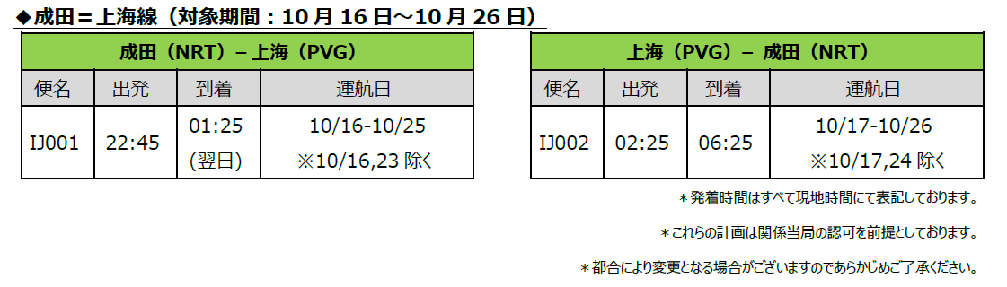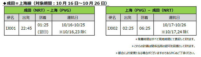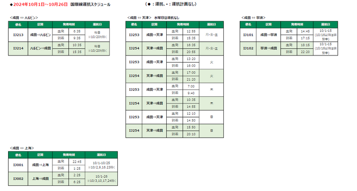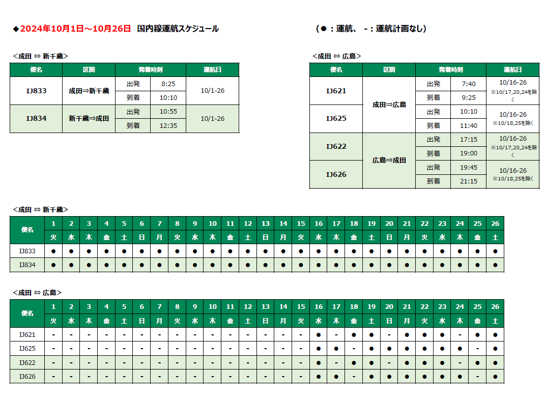 スプリング・ジャパン 2024年9月~10月 国内線の販売開始および2024年10月16日~26日の上海線の増便について スプリング・ジャパン株式会社 2024-07-19 13:00 JALグループのLCCであるスプリング・ジャパン株式会社(以下:スプリング・ジャパン)は、2024年9月1日(日)~10月26日(土)までの成田=新千歳線および2024年10月16日(水)~10月26日(土)までの成田=広島線の運航を以下のとおり決定しました。また、2024年10月16日(水)~10月26日(土)までの成田=上海線の運航も決定し、本日7月19日(金)15時より販売を開始します。ダイヤの詳細につきましては、スプリング・ジャパン公式サイト(国内線/国際線)をご覧ください。 IJ国内線の時刻表・フライトスケジュール | SPRING JAPAN SPRING JAPANが運航する日本国内線の最新のフライトスケジュールを掲載しております。お客様の旅行の計画にお役立ていただけます。 https://jp.ch.com/time-table IJ国際線の時刻表・フライトスケジュール | SPRING JAPAN SPRING JAPANが運航する国際線の最新のフライトスケジュールを掲載しております。お客様の旅行の計画にお役立ていただけます。 https://jp.ch.com/flights/new-a-time-table-1 【国内線】 【国際線】 ジャンル: 旅行・お出かけ タグ: 飛行機旅行航空会社レジャー国内旅行海外旅行 画像一覧 一括ダウンロード