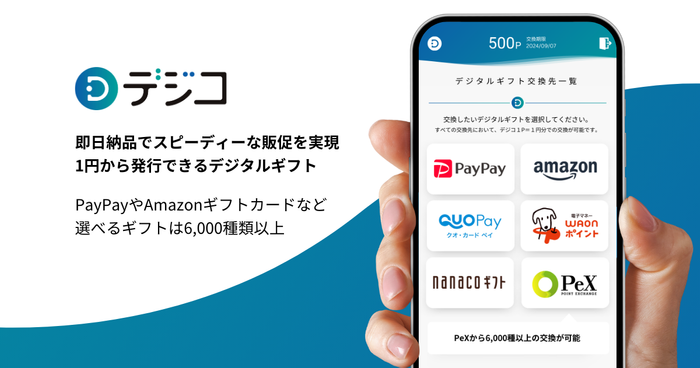 「デジコ」(https://digi-co.net/)は、初期費用・月額費用無料で、PayPay、Amazonギフトカード、QUOカードPay、nanacoギフト、WAONポイントID、Apple Gift Card、Google Play ギフトコード、PeXポイントギフトなどに交換可能なデジタルギフトサービスです。1円単位1枚から当日発行することが可能です。いつでもすぐに必要な分だけ発行することができるため、企業の広告予算の調整や急なキャンペーンの実施などにも柔軟に対応することができ、当日まで人数把握が難しいイベントの謝礼などにも幅広く活用することが可能です。