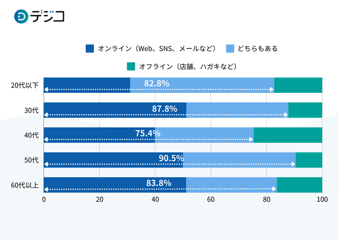 参加したことがある販促キャンペーンの応募形式について聞いたところ、全世代共通して「オフライン」よりも「オンライン」のキャンペーンに参加したことのある割合のほうが高いことが分かりました。シニア世代に関しても、83.8%が「オンライン」のキャンペーンに参加したことがあると回答し、世代を問わずオンラインで応募する販促キャンペーンが一般的になっていることが明らかになりました。