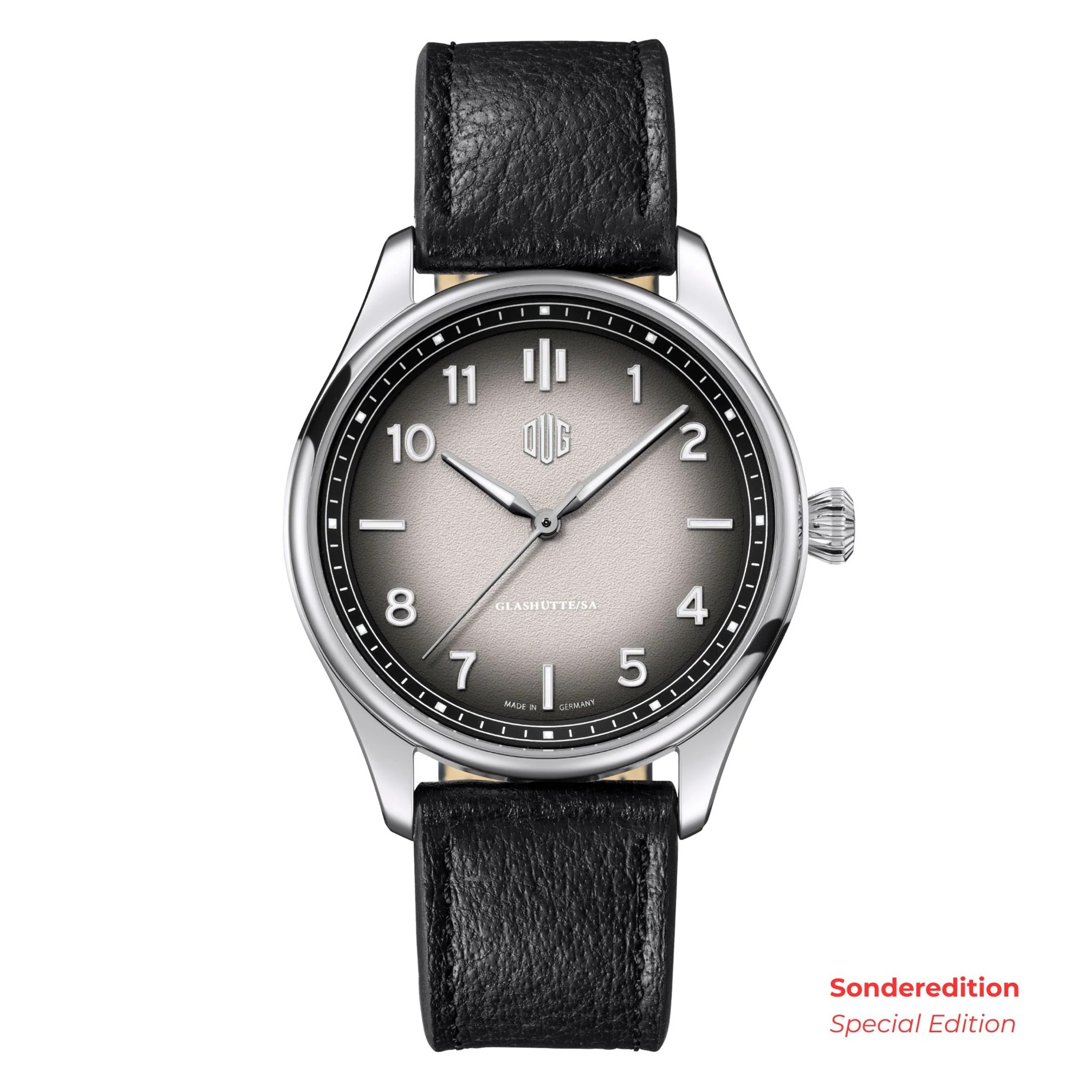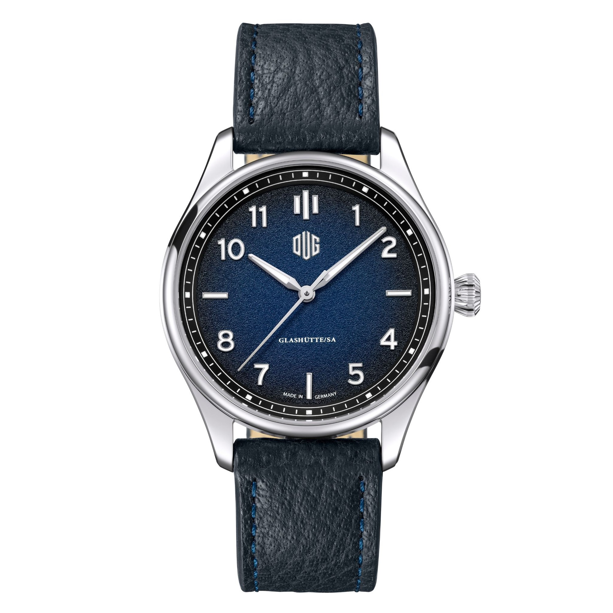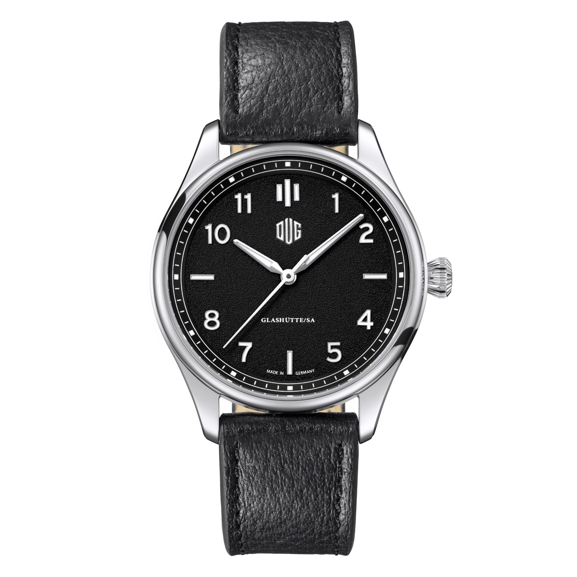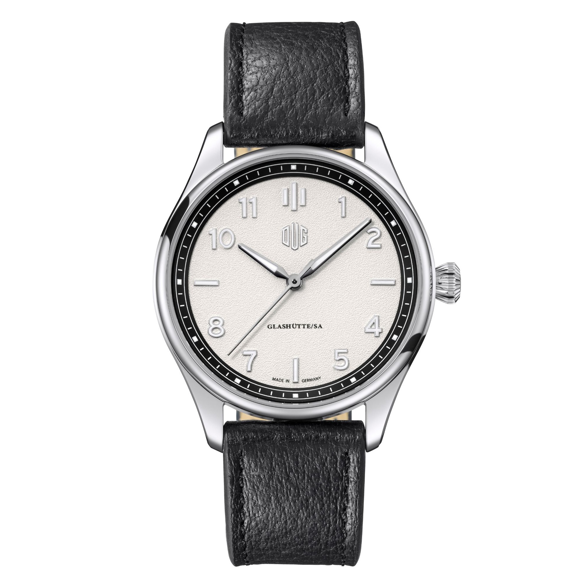 日本初展開となる「Purist(ピュリスト)」は、DUGの思想を最も分かりやすく体現するモデルです。“Purist(純粋主義)”という名の通り、デザインは装飾を抑え、視認性と整った構成を重視しています。文字盤はバランスの取れたレイアウトで設計され、視認性の高いアラビアインデックスと端正な針が調和。余白の取り方や目盛りの配置にも秩序があり、ドイツ時計らしい合理性と機能美が感じられます。
