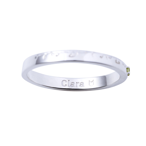 平打ちリングに魔界を連想するイバラのデザインを取り込み、イメージカラーストーンをセット。内側に名前と使い魔のアイコンを刻印しました。