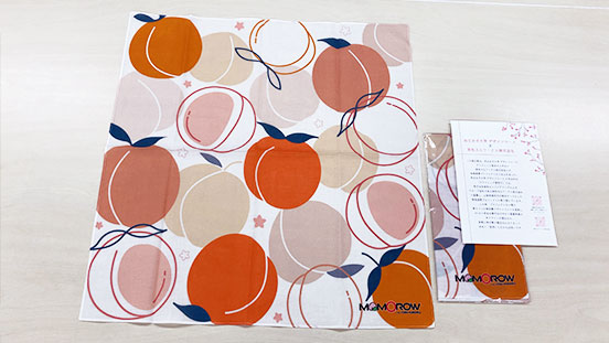 また、同プロジェクトで初の取り組みとなる「桃をつつむ風呂敷デザインコンペ」を実施しており、36点の学生応募作品の中から最優秀賞を受賞した学生への表彰が行われました。実際に製品化された風呂敷は、MOMOROW Westで商品を購入したお客様にプレゼントされるなど、桃好きの皆さんのもとに届けられました。
