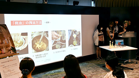 東和エンジニアリングでは、2024年5月に笛吹市に東和AGワークス本社(春日居町熊野堂)を移転。また同敷地内に桃を通して人々が集う交流拠点である「ちょもろうビレッジ」をオープンさせており、農業への積極的な参加やイベントにより地域を盛り上げる提案に注目が集まりました。また、桃の美容雑貨の提案では、デザイン提案にとどまらず、桃の種子から実際に「桃油」を搾油するという実践的な活動に驚きの声も上がりました。