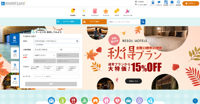 リソルライフサポートでは、『ライフサポート倶楽部』に加入する企業・団体の従業員向けに、旅行・グルメなどの特典情報を掲載する会員専用サイト「メンバーズナビ」を通じ、今後も独自の強みの訴求しながら、会員に喜ばれるメニューの拡充や利便性向上に向けたシステム開発を強化し、福利厚生事業の拡大を図ります。