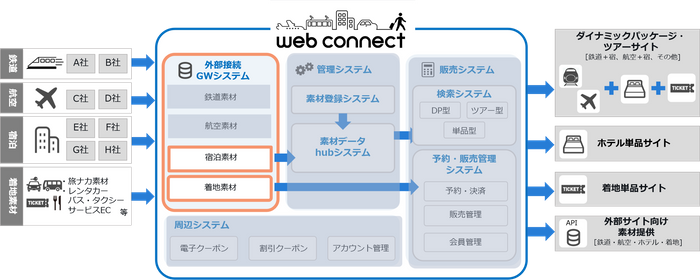 フォルシア株式会社が提供するwebコネクトは、必要な機能を必要な範囲で利用可能なSaaS型プロダクトです。商品のオンライン販売に求められる素材登録(造成)、検索、予約、電子クーポン、外部接続ゲートウェイといった機能群をモジュール化。国内・海外の多種多様な素材提供会社の素材をコネクトし、動的な商品登録(造成)・商品検索・商品流通・販売を、柔軟かつスピーディに実現します。