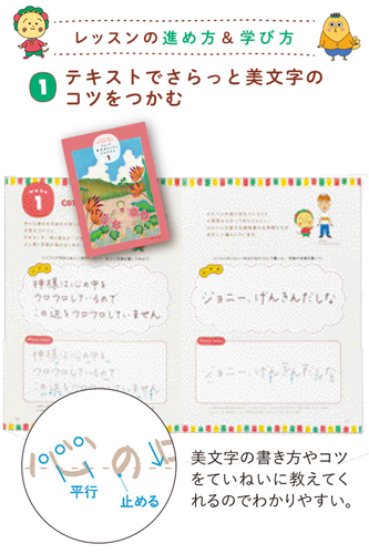 テキストで美文字のコツをつかんだら、練習帳でなぞり書きをします。文字を練習するだけに留まらない、ユーモアと遊び心満載のレッスン内容です。