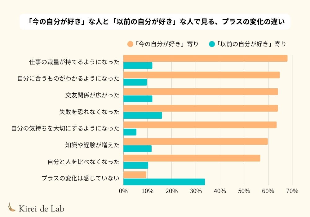 また、「自分に合うものがわかるようになった」と答えた人でも、“以前の自分が好き”な人は9.8%だったのに対し、“今の自分が好き”な人は64.8%と、約6.6倍となっています。ほかのプラスの変化でも同様の傾向が見られました。