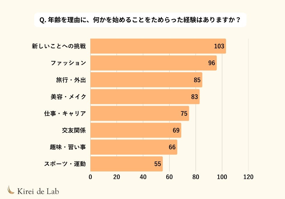 さらに、年齢を理由に何かを始めたり楽しんだりすることをためらった経験については、 **「特にない」が36.7%** にとどまり、反対に言えば **6割以上が何らかの場面で年齢を意識した経験がある** ことがわかりました。ためらったこととしては、 **「新しいことへの挑戦」、「ファッション」、「旅行・外出」、「美容・メイク」、「仕事・キャリア」** などが挙がっています。