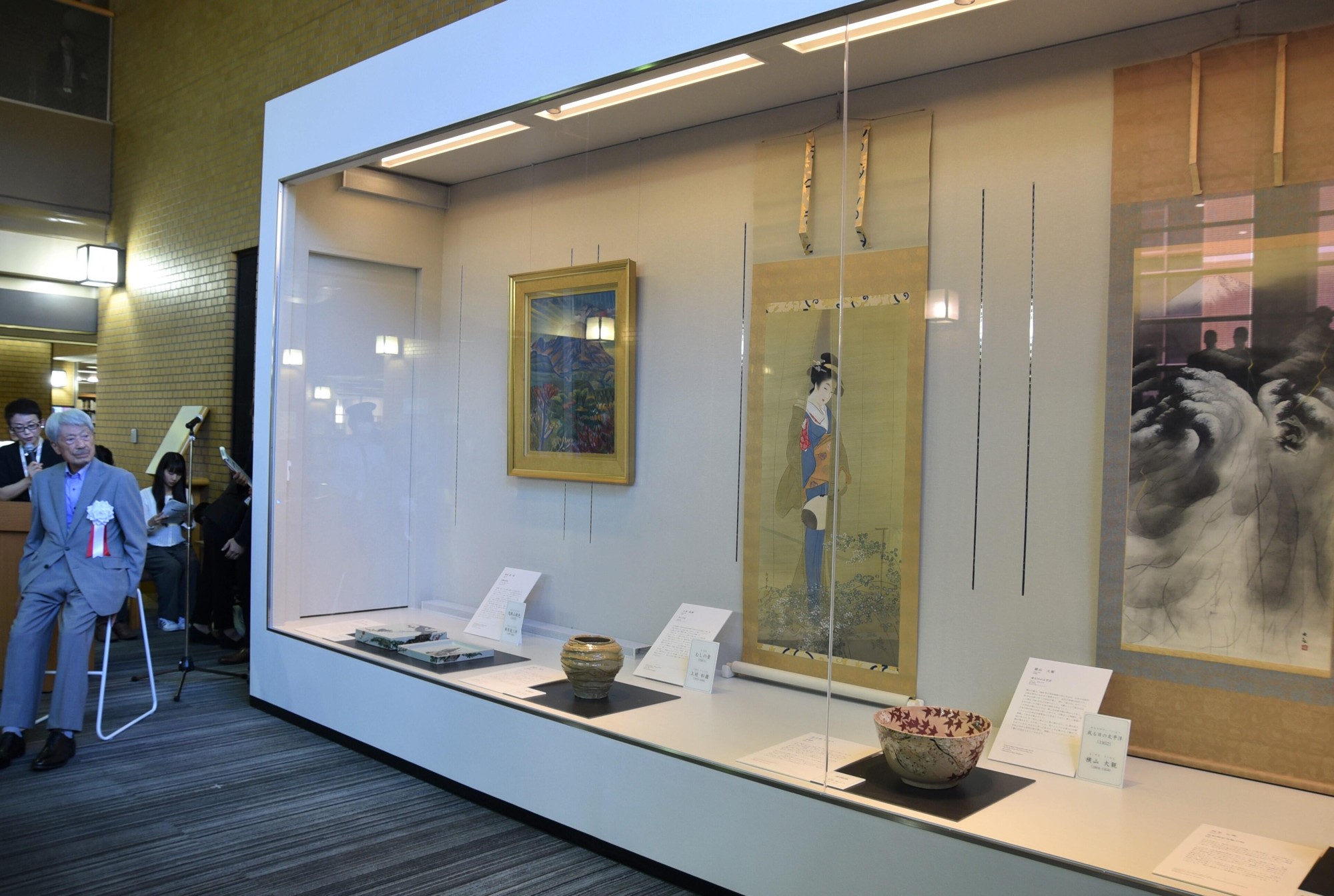 今回は、長年にわたり蒐集してきた貴重な美術品の数々について「学生たちが直接触れて感性を磨く機会を提供できれば」と、掛け軸は横山大観作「或る日の太平洋」や上村松園作「むしの音」、絵画では梅原龍三郎作「浅間山秋色」や加山又造作「猫ト牡丹」、陶磁器では北大路魯山人作「雲錦鉢」や岡部嶺男作「灰釉壷」など、明治初期から現代に至る著名な作家たちの総額10数億円に上る美術品245点を寄贈していただきました。