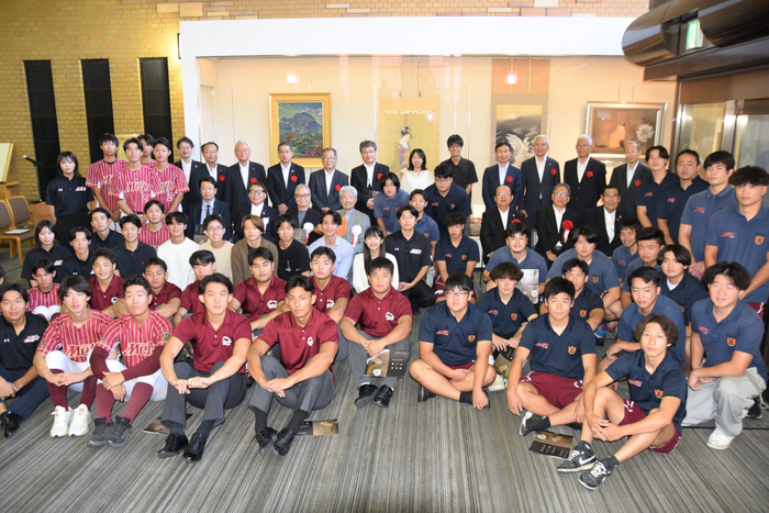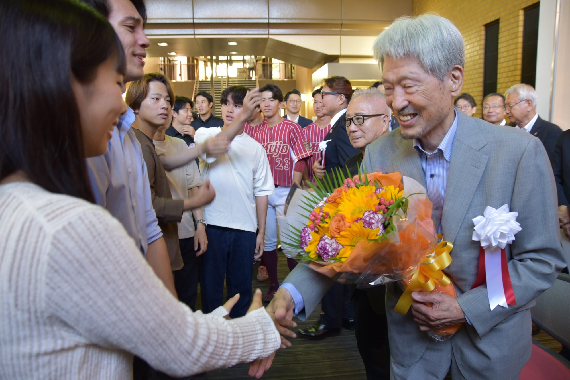 さらに、学生からの感謝の気持ちを込め、理工学部3年の小池百香さんから長谷川顧問に花束が贈られました。最後に、長谷川顧問があいさつし「美術品に加えてトヨタ自動車の株式も寄付したので、奨学金として心ある学生たちのために使ってほしい。そして、豊かな日本を築いていく卒業生が名城大学から出ることを期待したい」と述べました。セレモニーには長谷川顧問から部活動で支援を受けているアメリカンフットボール部とラグビー部、準硬式野球部の部員らも駆けつけ、式後には長谷川顧問とともに記念写真に収まりました。