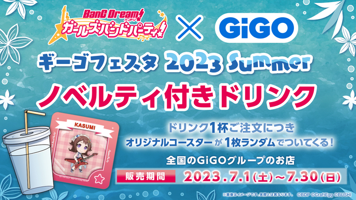 株式会社GENDA GiGO Entertainment(本社:東京都港区 代表取締役社長:二宮 一浩 以下当社)は GiGOグループのお店におきまして、株式会社ブシロード(本社:東京都中野区、代表取締役社長:木谷高明)と株式会社Craft Egg(本社:東京都渋谷区 代表取締役:森川 修一)の共同制作によるスマートフォン向けゲーム『バンドリ! ガールズバンドパーティ!』とコラボレーションを実施致します。全35人のメンバーから7人ずつ描き下ろし、5回に渡って行う「ギーゴフェスタ」の第2弾を2023年7月1日(土)より開催致します。 夏らしくさわやかで軽やかな装いの各メンバーは必見です。