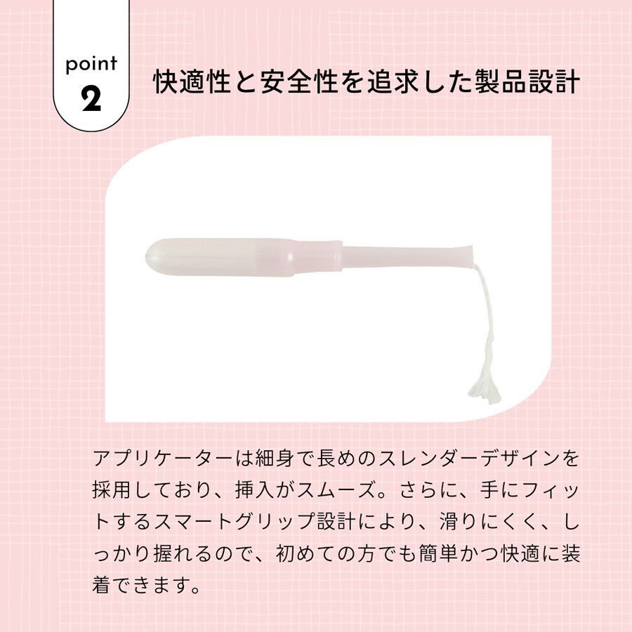 従来のナチュラムーン生理用品シリーズと同様に吸収体には天然素材(コットン)を採用。タンポンには体内に直接挿入して使用するという特性があり、製品の本体である吸収体を100%オーガニックコットンで製造することにこだわりました。