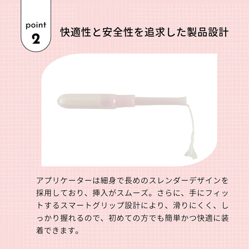 タンポンは、経血を吸収する「吸収体」と呼ばれる繊維を腟内に入れることで、経血を直接吸収する生理用品です。ナチュラムーンタンポンは、その吸収体に100%オーガニックコットンを使用した生理用タンポンです。タンポンは体内に挿入して使用するため、初めての方でも安心してお使いいただけるよう素材選びにこだわり、挿入しやすいアプリケータータイプを採用しました。