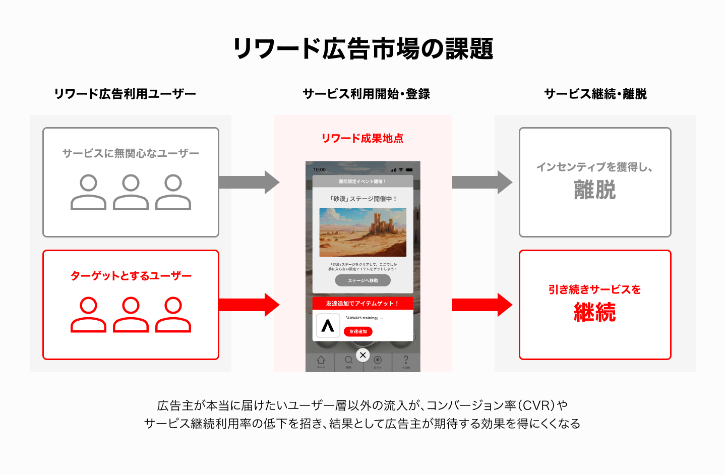従来のリワード広告は、その特性上「特典の獲得」を主目的とするユーザーが多く流入する傾向にあります。そのため、広告主が展開する商品・サービスへの関心が薄いユーザーや、想定ターゲット層とは異なるユーザー、インセンティブを獲得後すぐに離脱してしまうユーザーなどが含まれやすく、獲得したユーザーの質が担保されにくいという課題が顕在化しています。