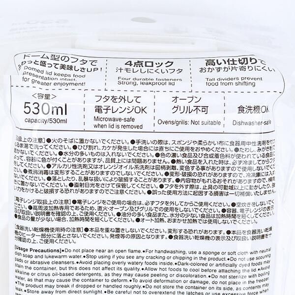 おかずがつぶれにくいドーム型のフタで、”ふんわり”とご飯やおかずを盛りつけておいしさアップしそうです。高い仕切付きでおかずが片寄りにくい、4点ロックの密封式で汁漏れしにくいなどかわいいだけではなく、お弁当としての嬉しいポイントも盛りだくさんです。食洗機・フタを外して電子レンジ使用可◎【容量:530ml】サイズ:6.2cm×18.6cm×10.8cm 素材:フタ:AS樹脂(耐熱温度100度)、本体・止具・仕切:ポリプロピレン(耐熱温度140度)、パッキン:シリコーンゴム(耐熱温度140度)