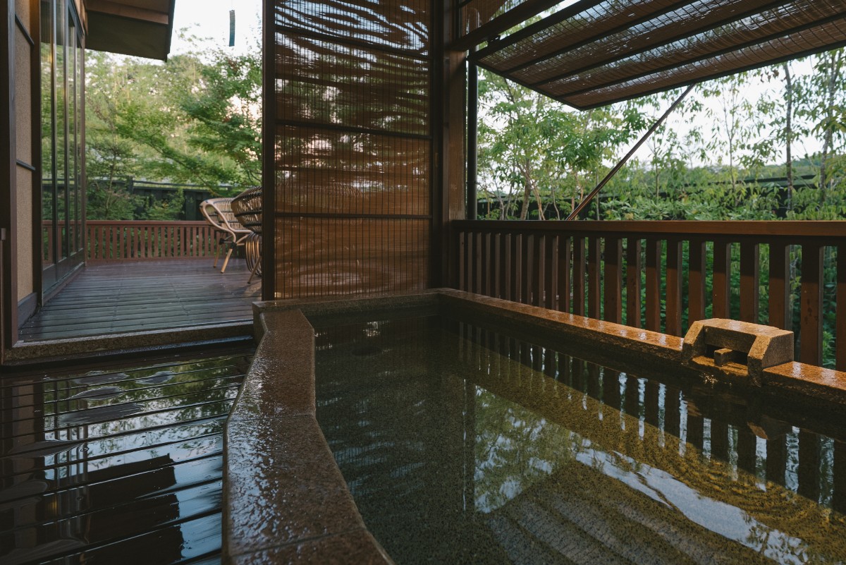 ふたつの寝室と茶室、ミストサウナ付き温泉風呂を備え、