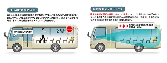 ・降車時にドライバーに車内確認を促す降車時確認と、レーダーセンサーによる自動検知で、置き去りを二重にチェックできます。