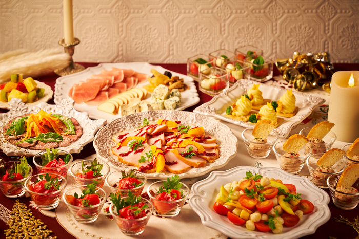 ポテトサラダツリー,牛肉のタリアータ パルメザンチーズと共に,サーモンのビーツマリネ,スモークターキーのクランベリーソース,小柱とズッキーニ ハーブの香り,チキンのリエット メルバトースト添え,モッツアレラチーズとトマトのカプレーゼ,ミックスサラダ,チーズ&ドライフルーツ,生ハム&フルーツ