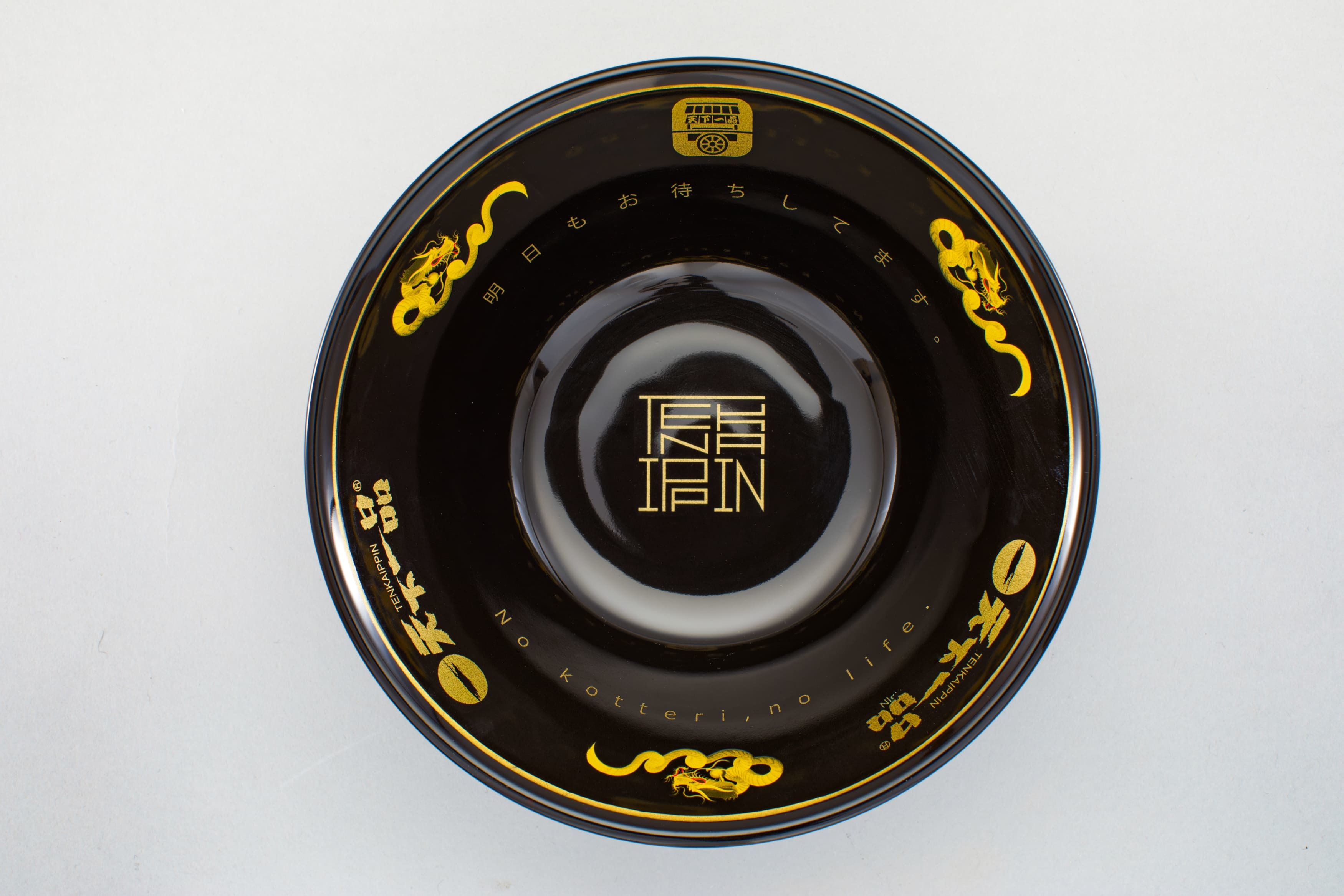 どんぶりの内側には、黄金に輝く龍が描かれており、これは京都・桜凛堂の一筆龍絵師・手島啓輔氏が天下一品のために描いたもの。一筆龍とは、龍の胴体部分を一筆で描き「ひとつなぎで途切れない」ことから「人を繋ぐ」「ご縁が途切れない」と演技が良いとされています。