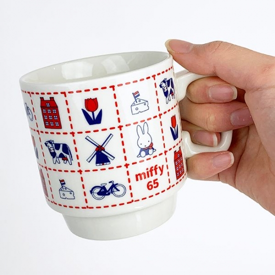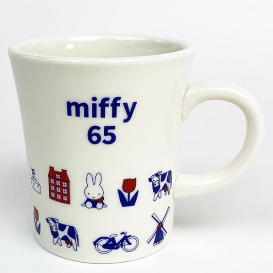 まずは、ミッフィー生誕65周年の今年、続々と出ている新商品のうちの一つであるダッチモチーフのマグです。オランダを連想させる風車やチューリップなど、かわいいデザインが下半分に描かれています。65周年を記念するロゴも入っているので、記念グッズとしてもぜひゲットしてくださいね♪
