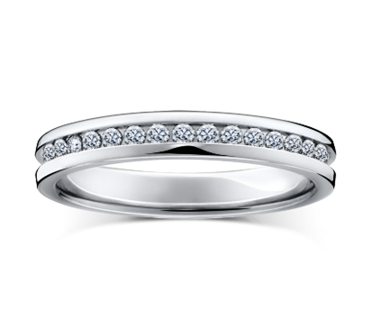 レール留めという手法でダイヤモンドの周りが覆われていて凹凸が無く、美しさが引き立ち、ふだんの生活でも使いやすいデザイン。