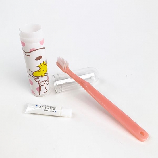 コーラルピンクがキュートな、スヌーピーのハグデザインの歯ブラシセットです。