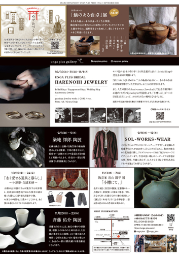 ウラ面は、2階の「unga plus gallery」で、9月から11月に催される各種イベントの情報になります。新しい試みとして、5名の作り手によるブライダルリングの作品展&受注会「HARENOHI JEWELRY」のことや、オリジナル土鍋の発表会となる「鍋のある食卓展」など、小樽百貨UNGA↑ならではの楽しいイベントやフェアが盛りだくさんです。