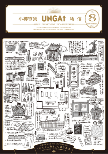 最新号vol.8のオモテ面は、お店のこと、商品のこと、コンセプトのこと、そのほかいろんな想いをギュッとイラストでわかりやすく描いています。より深堀して愉しみながら、小樽の歴史を伝える小樽百貨UNGA↑のお店づくり、商品づくり、イベントのことに興味を持っていただけたら嬉しいです。