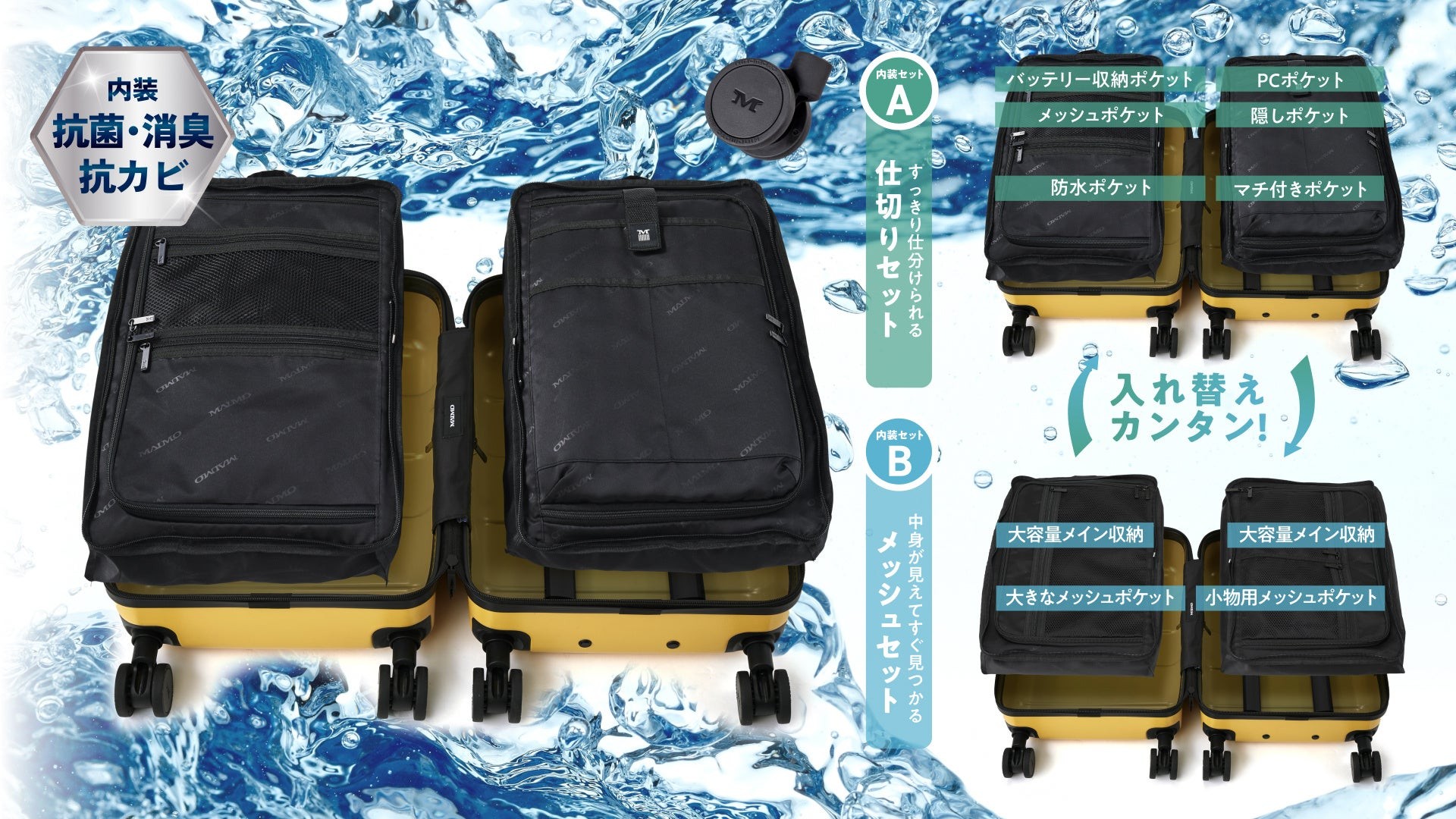 これら2種類の内装を使い分けることで、荷造りが驚くほどスムーズになります。 内装はすべて抗菌・消臭・抗カビ加工済み。 汚れやニオイを気にせず清潔を保てるため、収納の悩みから解放された、心から楽しめる快適な旅を実感できます。