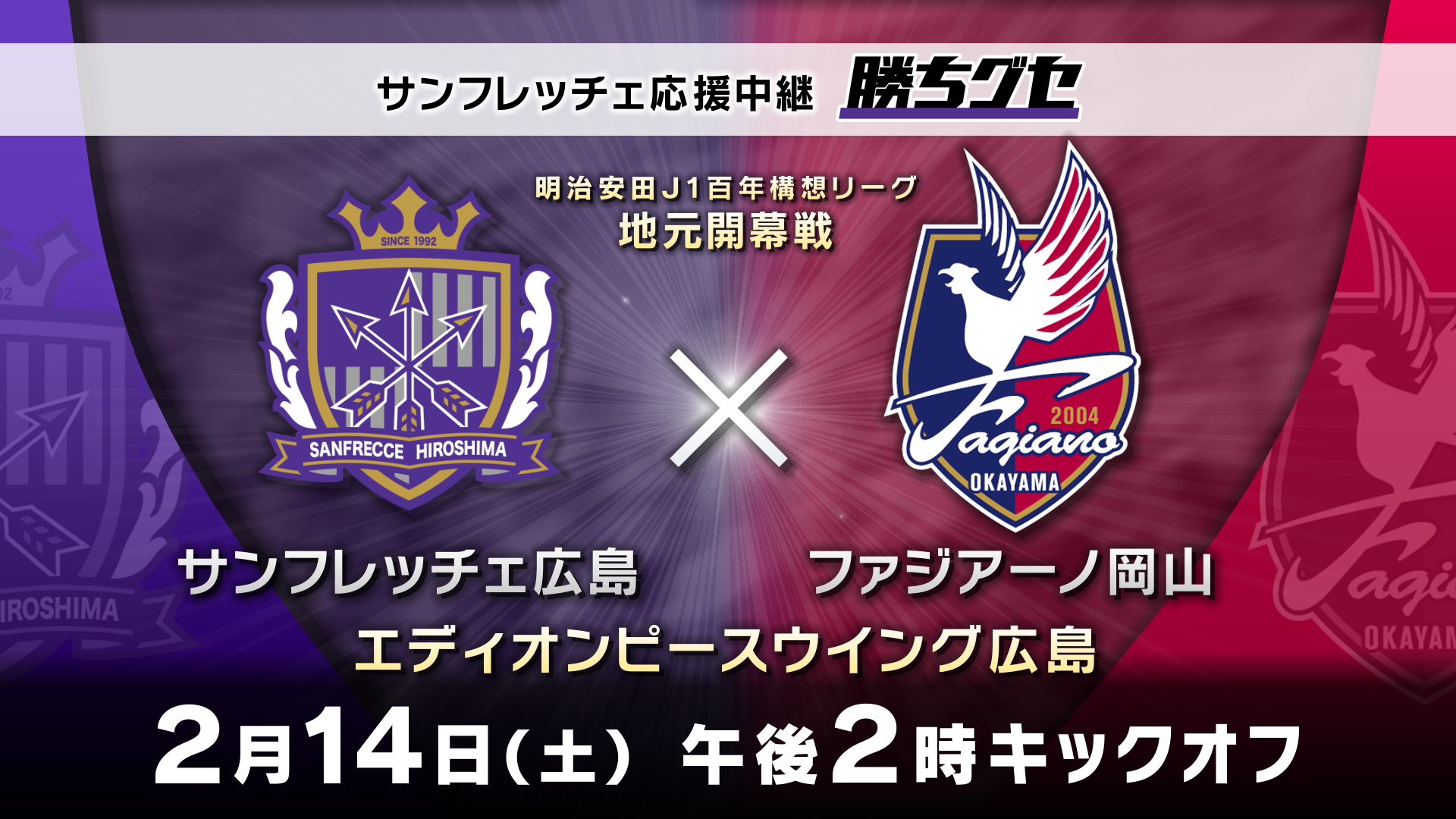 広島ホームテレビ(HOME:本社・広島市中区)は、2月14日(土) 午後1時55分からサンフレッチェ応援中継 勝ちグセ「サンフレッチェ広島 対 ファジアーノ岡山」の試合を放送します。