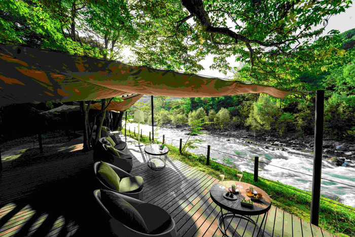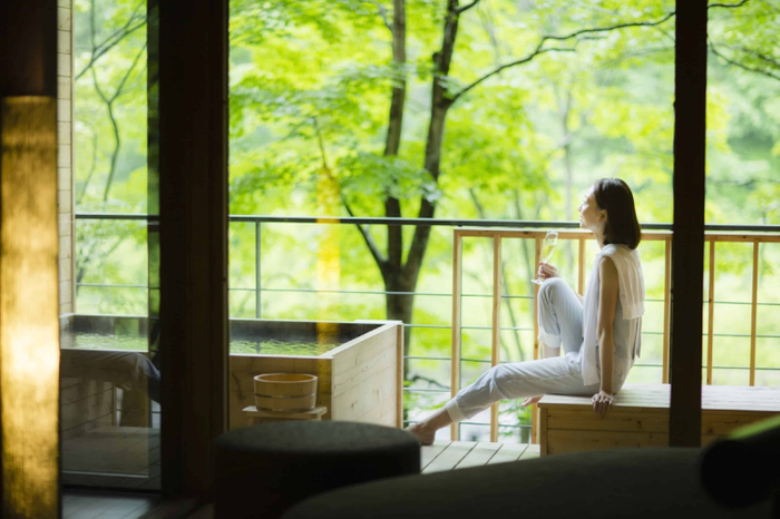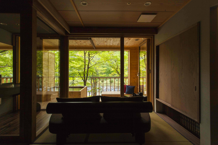 当プランで用意しているのは、広さ60平米の露天風呂とテラス付きの客室です。雄大な自然を間近に感じられる渓流に面した客室で、美しい自然を最大限に楽しめるよう、窓際には広々としたソファを用意しています。滞在中は、美しい景色を眺めたり、好きな時間に露天風呂に浸かったり、テラスで読書をしたり、目の前に広がる大自然を前に心が安らぐ時間を過ごせます。