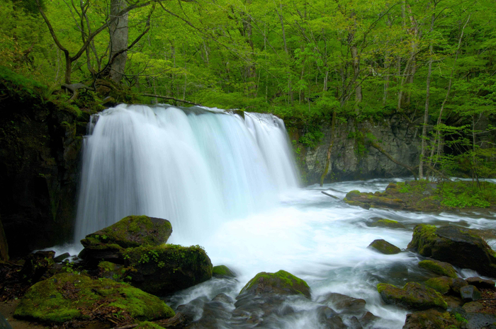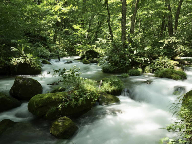 奥入瀬渓流には、激しい流れが印象的な「阿修羅(あしゅら)の流れ」や、高さ20mの落差を誇る「雲井(くもい)の滝」、高さ7m幅20mの迫力ある「銚子(ちょうし)大滝」など、美しい名所が点在しています。朝日に照らされ繊細な輝きを放つ静かな早朝、水量が増し迫力溢れる昼間、木漏れ日が降り注ぎ森の陰影が美しい夕暮れなど、時間帯によって見える景色も様々です。当ツアーでは、通常は案内していない静かで美しい森が続く下流域から、名瀑が連なる上流域まで、参加者の希望に合わせてガイドがツアーをアレンジするため、歩くと片道約5時間半かかる全長14kmの奥入瀬渓流の見どころを短時間で満喫できます。渓流が最も光り輝く様子を見られることも、通常のガイドツアーとは異なり、早朝に実施する当ツアーのポイントです。早朝の清々しい渓流で、そよ風や野鳥の鳴き声、森の香りを感じながらリフレッシュできます。