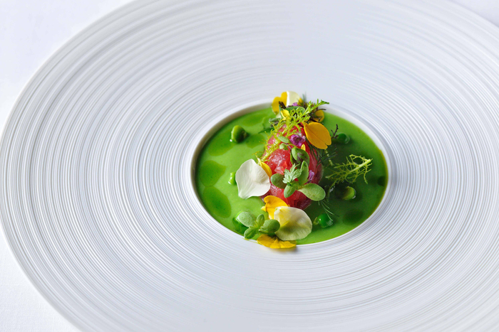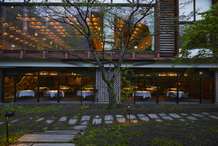夕食は、フレンチレストラン「Sonore(ソノール)」に変更も可能です。Sonoreとは、フランス語で「朗々と響かせて」という意味の音楽用語です。渓流の瀬音や旬の食材を駆使したフランス料理、希少なワインが心身に朗々と響き渡るという意味を込めました。レストランでは、季節の食材をふんだんに使用し、素材の味を生かしたこの場所でしか味わえないコース料理を提供しており、それぞれの料理に合わせたペアリングの提案も行っています。奥入瀬渓流の自然をイメージした空間で、四季折々の景色を眺めながら贅沢なひと時を過ごせます。