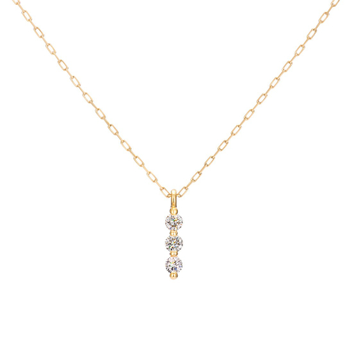 3つのメレダイヤモンドが、胸元でさりげなくきらめくネックレス。繊細なチェーンと小ぶりなペンダントトップの組み合わせは自然と肌に馴染むことから「スキンジュエリー」とも呼ばれ、まるで自分の一部かのようにデイリーに身に着けられます。