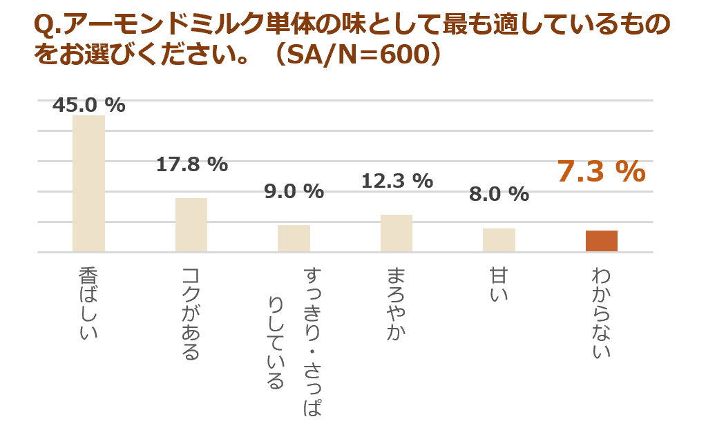 アーモンドミルクの利用実態に関する調査を行ったところ、単体で味わったことがある人は回答者の77%でした。ところが、アーモンドミルクのそのものの味について「香ばしい」と評価する人が半数近くいる一方で、「わからない」と答える人も7.3%いる結果となりました。身近な飲料になっているようで実はその味が深く理解されていない場合もあるようです。