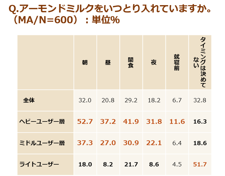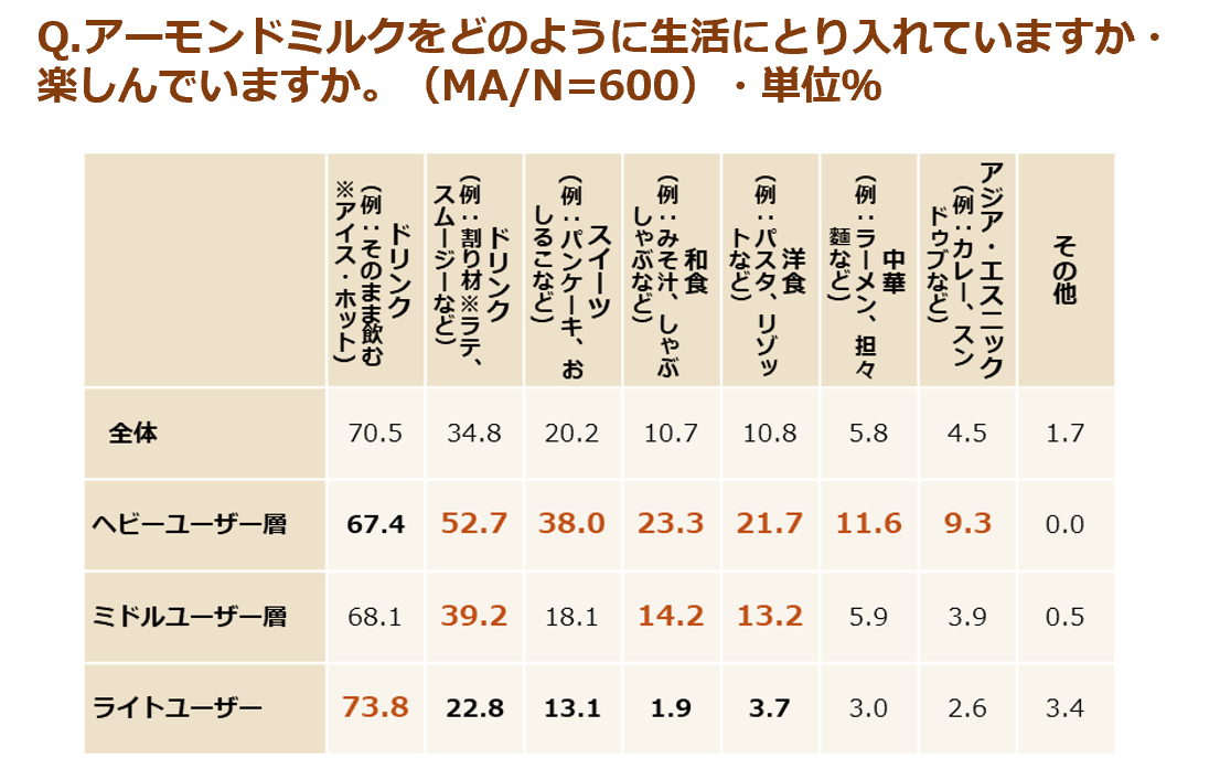 アーモンドミルクヘビーユーザー層は生活の様々なシーンでアーモンドミルクを取り入れている