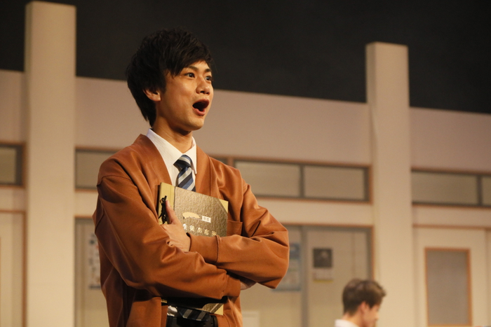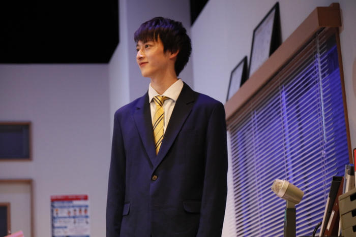 「新任教師・村田を演じます。役も新任ですが、僕自身も初めて舞台に立つので、緊張しています。(一緒に舞台に立つ)3人の先輩方に助けていただきここまで頑張ってきました。お稽古期間が短くて、最初は不安でしたが、この4人だからこそ、濃密な稽古の時間を過ごせたと思います。あとは本番を頑張るのみです!中学生時代の僕は、間違えたヘアセットをしていました(笑)それは間違いだよ!と伝えたいです。」
