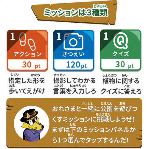 かいけつゾロリを案内役として、舎人公園に新しくオープンした「冒険の丘」だけでなく広い園内でアクション・写真撮影・クイズの3種類のミッションを進めてポイントを獲得していきます。獲得したポイントにあわせて舎人公園オリジナルかいけつゾロリ缶バッチをプレゼント(なくなり次第終了)。