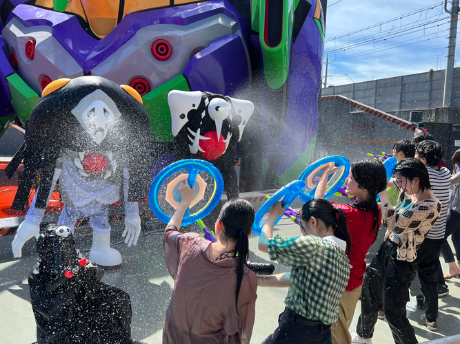 東映太秦映画村では、2020年秋、世界初の乗れるエヴァとして、高さ15mの圧倒的存在感を放つ初号機が話題となり、昨年の夏は、お客様を夏の特別演習に参加するパイロット候補生に見立て、巨大な使徒が襲う試練に見舞われる設定のショーを実施。ウオーターキャノンが炸裂する最中に繰り広げられる“スプラッシュ体験”が大変好評をいただきました。