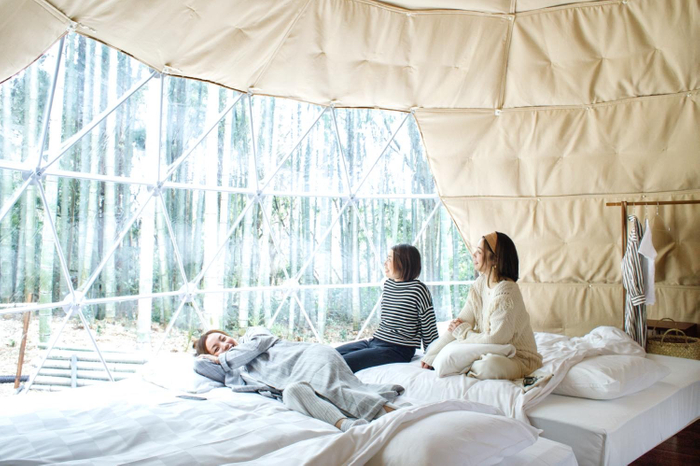 都内から約1時間でアクセスできるTHE BAMBOO FORESTは、千葉県市原市のふれあい動物園 アニマルワンダーリゾウト・サユリワールド(有限会社市原ぞうの国)に隣接したグランピング施設です。秘密基地のようなツリーハウス、ラグジュアリーな空間を楽しめるドームテントなど、シーンに合わせて6棟の客室から選択可能。宿泊サービスにはサユリワールドの入園チケット1回分が含まれており、動物と竹林に囲まれながら、都会では味わえない癒しのひとときをお過ごしいただけます。