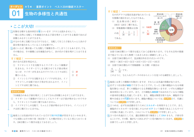 教科書の中から共通テストで必要な知識が習得できるように、まず第1編に20のターゲットがあります。1つひとつのターゲットは「ここが大切!」→「すぐに確認!」→「念のために」という順で進んでいきます。まず「ここが大切!」を丁寧に読んでください。教科書でわかりにくかったであろう部分は特に丁寧に解説してあります。「すぐに確認!」で文字通り知識を確認し「念のために」で再度確認しましょう。