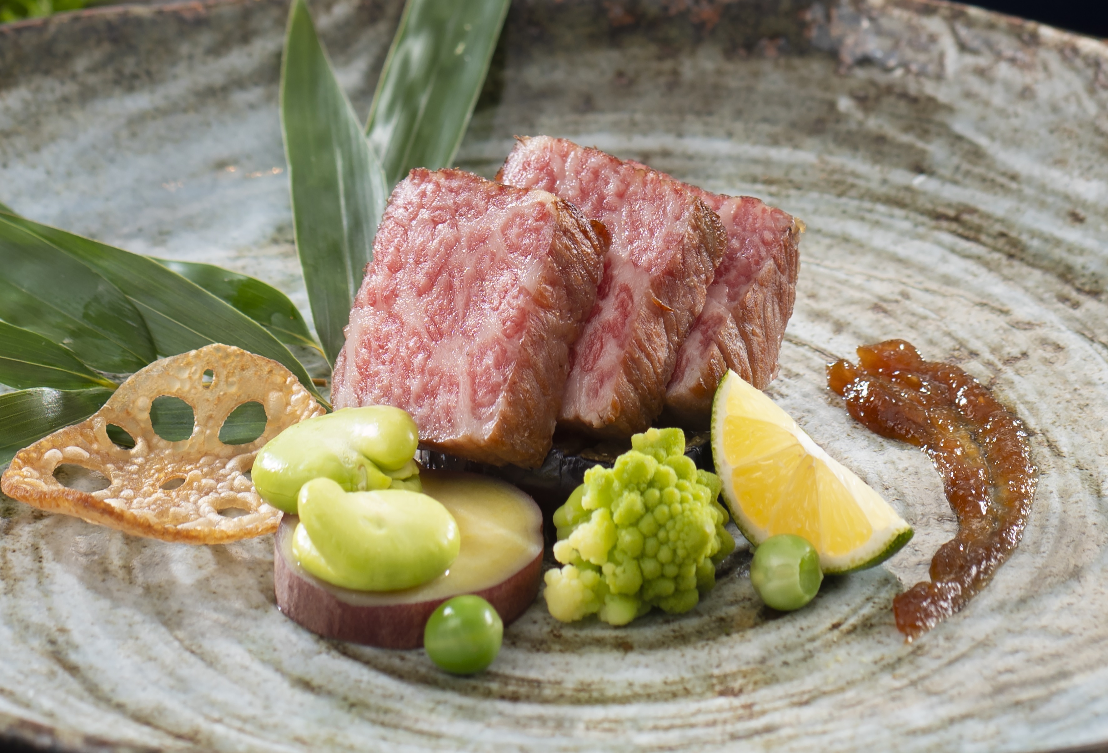 メインは、三重県の誇るブランド牛の松阪牛。中でも、特産松阪牛という「兵庫県産の子牛で、松阪牛生産区域で900日以上肥育した牛」を使用したサーロインステーキです。牛を長く肥育すればするほど、手間も費用もかかりますが、熟練の農家が1頭1頭大切に育て上げています。このように肥育されている牛は、世界的に見ても他に例がありません。その為、生産頭数が少なく、松阪牛全体の数パーセントしか存在しません。