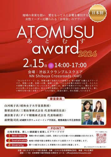 女性の事業承継支援コミュニティ「跡取り娘ドットコム(運営:一般社団法人日本跡取り娘共育協会)」は、家業を継承し、新たな価値を創造する女性たちを表彰する「あとむすアワード」のファイナリスト5名を決定いたしました。本アワードは、少子高齢化や後継者不足が社会課題となる中、女性ならではの視点で革新を起こす「跡取り娘」に光を当てる日本初の試みです。最終審査および授賞式は、2026年2月15日に開催されます。