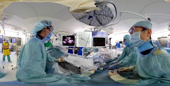 本コンテンツは、実際の患者へのTAVI手術を高精度360度撮影でVR化し、複数人で構成されたハートチーム全体の動きを把握することができます。本コンテンツでは、TAVI手術の各工程の重要ポイントをまとめた執刀医目線のダイジェスト版を制作しており、場面ごとにチームでの声がけや連携が体感できる設計となっています。また執刀医が手術中に常時確認している患者の心拍や血圧などのバイタル情報に加え、カテーテル手技自体を確認するためのアンギオ装置や、経食道心エコーによる画像情報を付加することで、よりトレーニングに適したコンテンツになっています。
