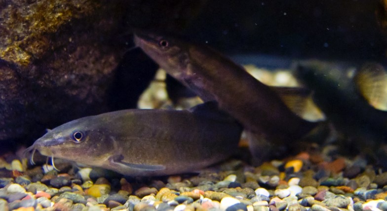アユモドキはドジョウのなかまですが、泳いでいる姿がアユに似ていることから、この名前がつきました。滋賀県・京都府・大阪府にまたがる琵琶湖淀川水系と岡山県の旭川・吉井川・高梁川水系、広島県の芦田川水系に分布しています。しかし、琵琶湖では昭和54年を最後に確認報告がなく、京都府南丹市の生息場所では過去約10年確認例がありません。1977年に国の天然記念物に指定されています。