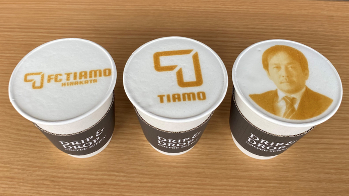 ラテアートにティアモロゴマーク2種類と、二川監督の絵柄、合わせて3種類が登場します。写真を忠実に再現した二川監督のラテアートは必見です。